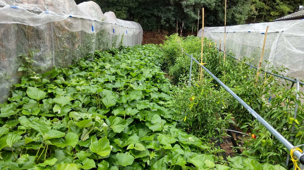 今夏の猛暑対策として、今年は点滴灌水のチューブを設置しました。高い場所にあるため池から、高低差を利用して水を引いています。ピーマンやアマナガトウガラシ、サツマイモにも少し点滴潅水をしました。どの夏野菜も、成長が止まらず、安定した収穫が得られました。