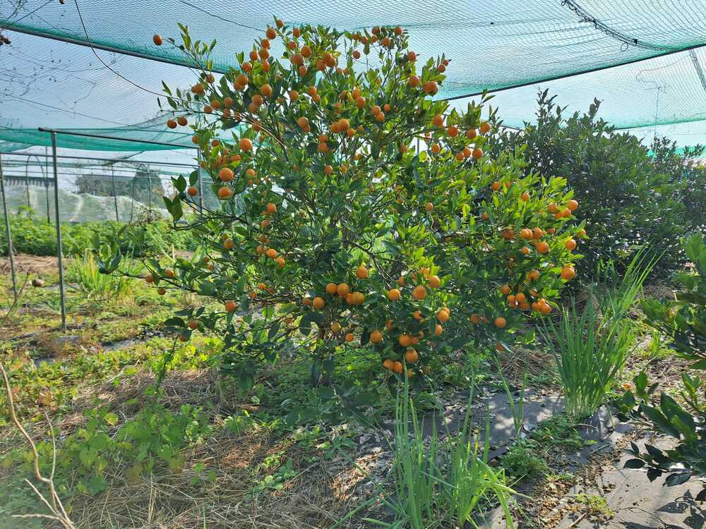 キンカンは、果実が大きくなり、色づきつつあるものもありますが、果実が熟すのは、もう少し先になりそうです。カラマンシーは、果実が色づき、ようやく収穫できるようになりました。