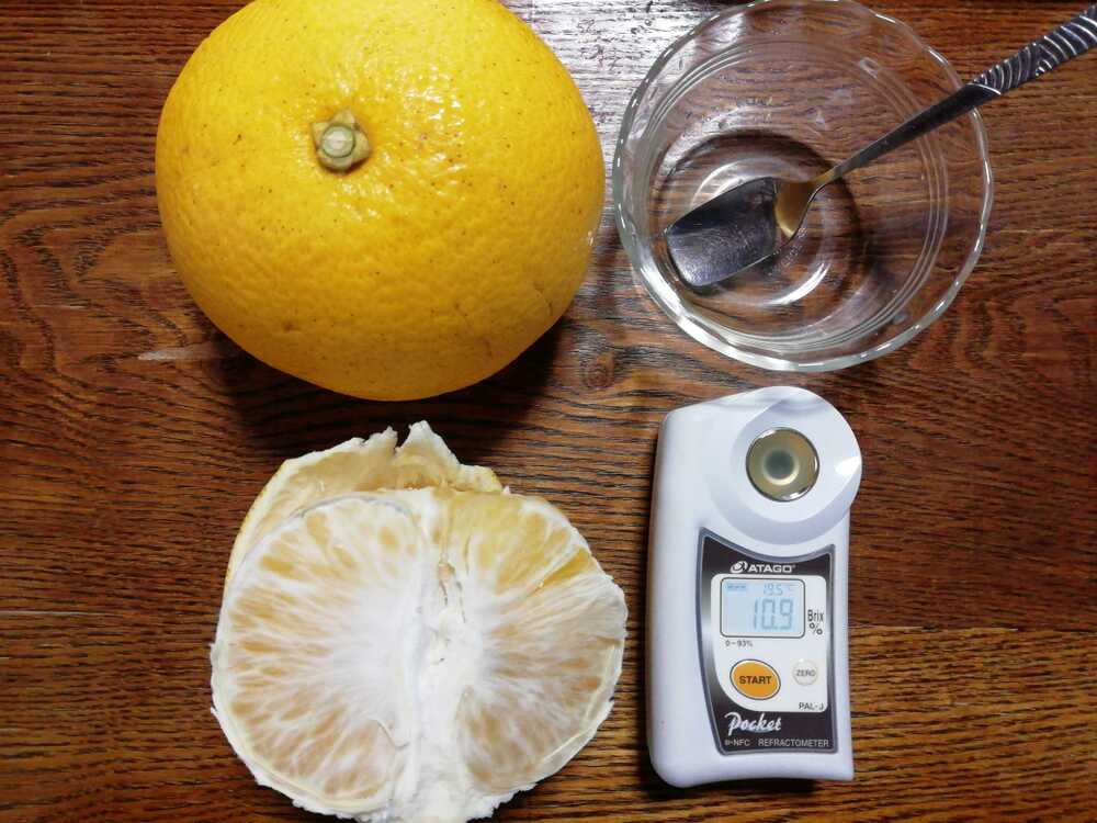 ハッサクは、例年どおり玉太り、色づきともよいため、昨日、収穫して試食したところ、糖度が10.9度あり、美味しく食べられました。