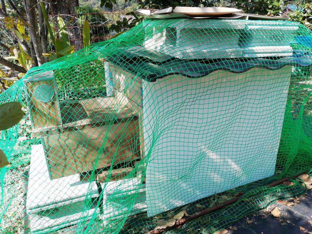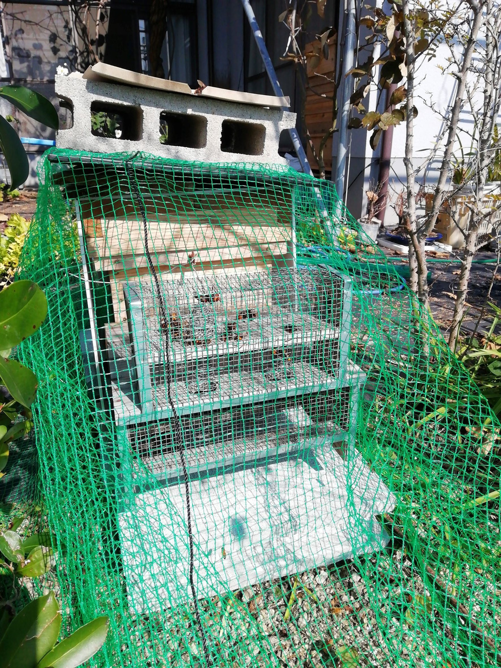 11月になっても、スズメバチの襲撃を受け、トラップを外せません。しかし、朝晩は、かなり冷え込むようになってきました。防寒対策として、プラダン(プラスチック段ボール)の箱をかぶせました。正面は、スズメバチのトラップが、プラダンの代わりです。