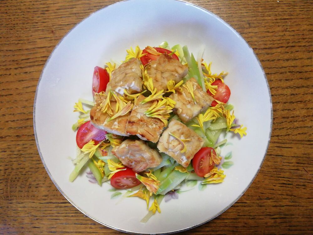 テンペはフライパンで炒め、ハヤトウリは生のまま千切り、ミニトマトは半分に切っています。その上に、生食できる食用菊「サラダマム」を散らしてみました。