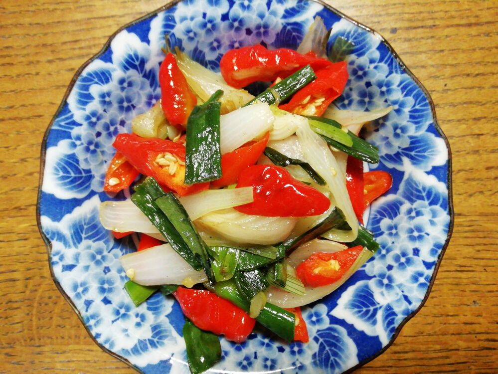 葉付きタマネギは、根も葉も食べられ、捨てるところがありません。調理例は、葉付きタマネギと完熟甘長の炒め物です。