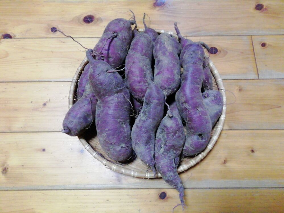 今年は、サツマイモの巨大化に悩みつつも、サツマイモの出来がよく豊作で、新商品「サツマイモたっぷり野菜セット」を販売しております。