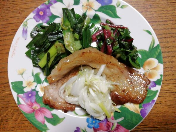 タマネギドレッシングをかけた豚肉のソテーに炒めたスイスチャード・タマネギの葉を合わせました