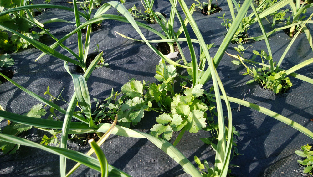 写真1枚目は、ニンニクです。ニンニクは、もう少し茎が伸びれば、「葉ニンニク」として収穫できます。こぼれ種から生えたパクチーは愛嬌です。「葉ニンニク」は、ニンニクの成長過程の若い葉で、ニンニクそのものに比べて香りや辛みがマイルドで、炒め物やスープに使われる香味野菜です。高知県の郷土料理である「ぬた」は、すりつぶした葉ニンニクと味噌、酢、砂糖を混ぜて作る調味料で、ブリの刺身には欠かせないそうです。