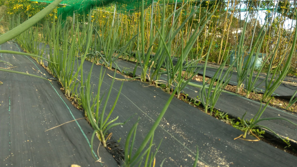 写真4枚目は、干しネギから育てた「九条太ネギ」です。夏前に、掘り上げて乾燥させた「九条太ネギ」を、秋に植えます。大きくなるのが、とても早いようです。
