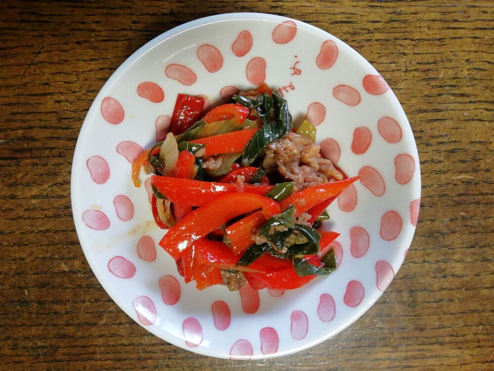 写真の1枚目は、完熟ピーマンと九条太ネギを牛肉と炒めています。完熟ピーマンも、九条太ネギも、苦みやあくがほとんどなく、それぞれの甘みを味わえます。