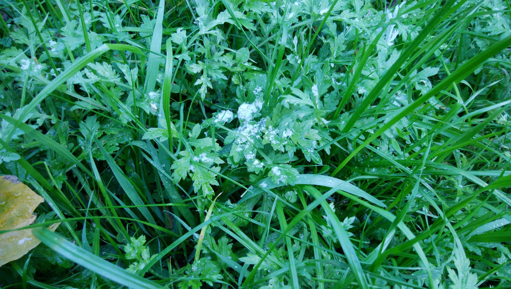 写真① 昨日の朝、畑には、夜に降った雪が残っていました。