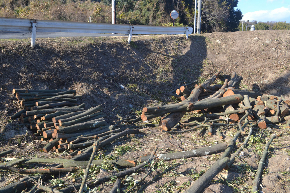 畑の北側に生えて日当たりを悪くしていた大きなカシの木を切りました。太い幹は薪に、中ぐらいの枝はシイタケの原木にします。