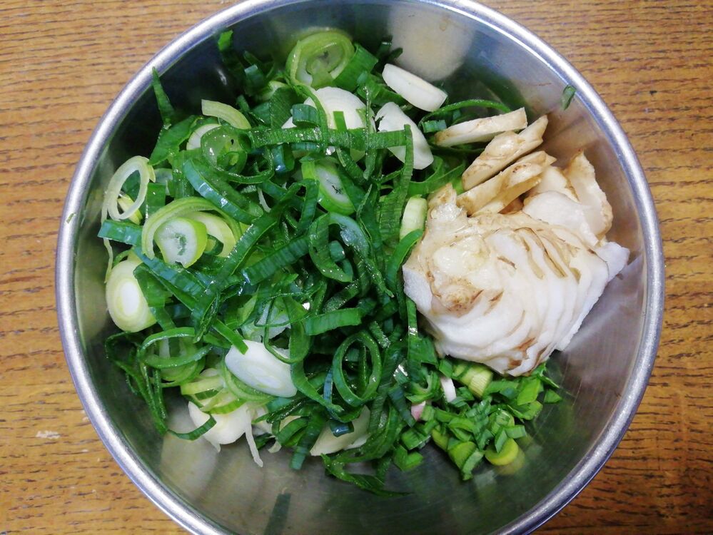 2022年1月6日(木)、昨夜から雨が降り、肌寒い一日になりそうです。こんな日なので、お昼は、温かい野菜ラーメンになりました。葉ニンニク、ネギ、キクイモなどが入っています。