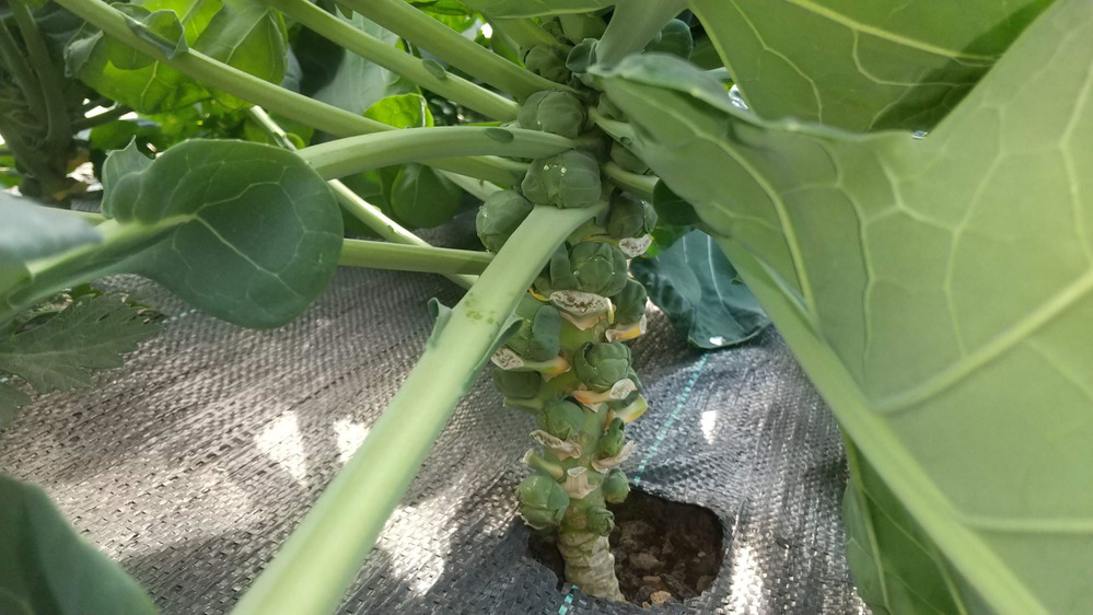 これから出荷できそうな新顔の野菜は、芽キャベツです。葉かきをした後、可愛い芽がかなり大きくなってきました。