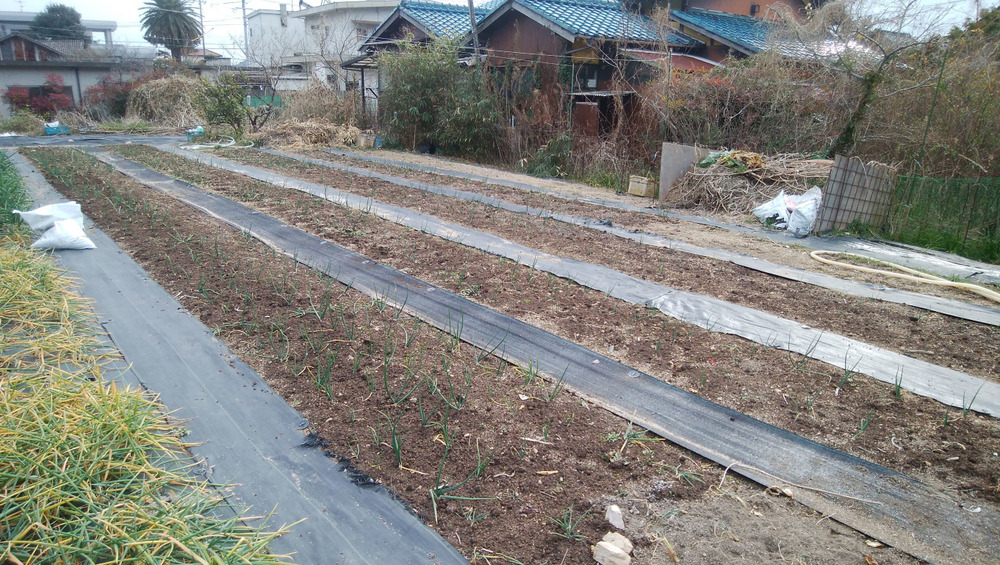 11月に苗を植えたタマネギは、地面の上に牛糞堆肥をまいて草が生えにくいようにする「堆肥マルチ」という栽培方法を採用しています。と言ってもすき間から草が生えるので、除草した後、ぬか・灰・おがくずを混ぜたものを追加でまいて、地面が露出しないようにしてみました。