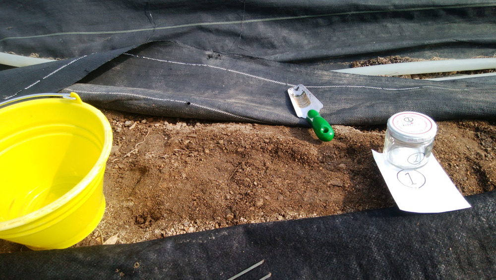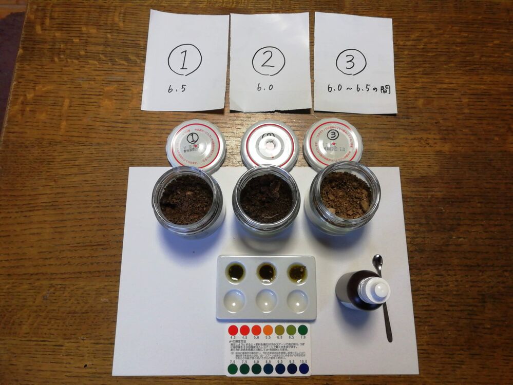 現在、ジャガイモを植える予定の畑は、雑草が生えないように防草シートで覆っています。対角線上の3か所から、それぞれ土を採取しました。採取した土に試薬を入れ、試薬の色でpHを判定します。サンプル①が6.0、サンプル②が6.0~6.5の間、サンプル③が6.5でした。