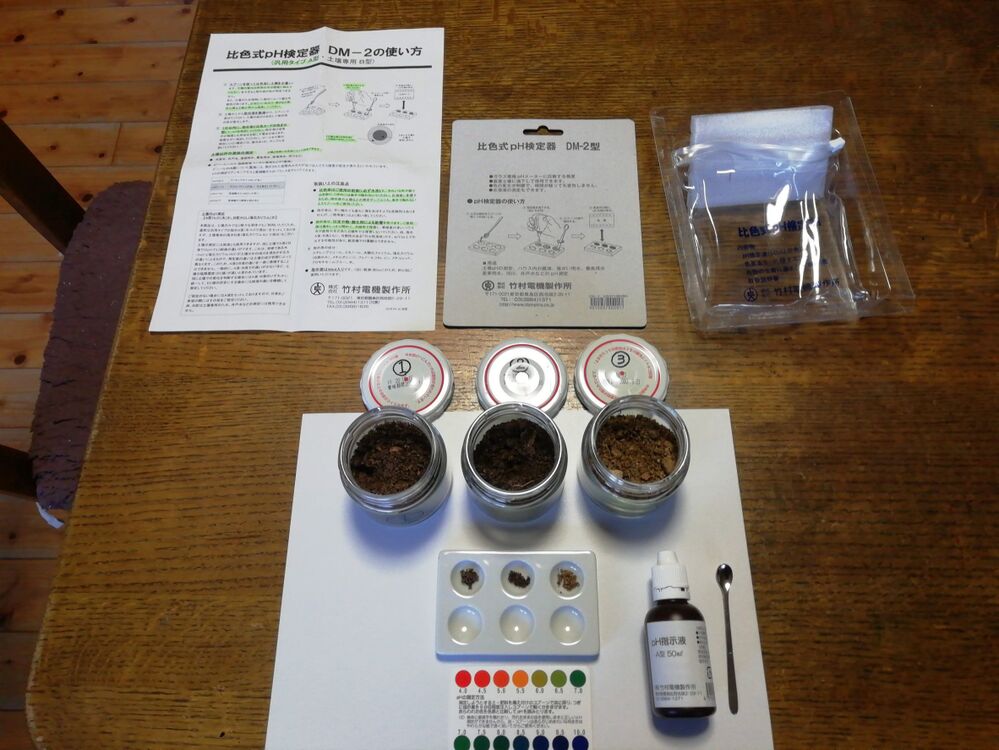 今週末、ジャガイモを植えるのを前に、比色式pH検定器を用いて土壌のpHを調べてみることにしました。pHが酸性に傾きすぎている場合は、石灰(当農場では牡蠣殻石灰)を撒いて、pHを調節する必要があります。