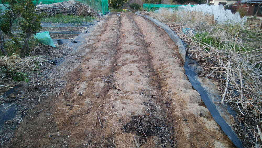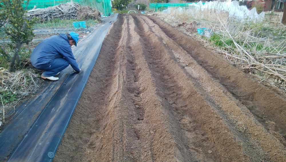 当農園では、サツマイモとジャガイモのリレー栽培をしています。ジャガイモを植える予定の場所は、11月のサツマイモ収穫後、雑草が生えないよう防草シートを被せていました。