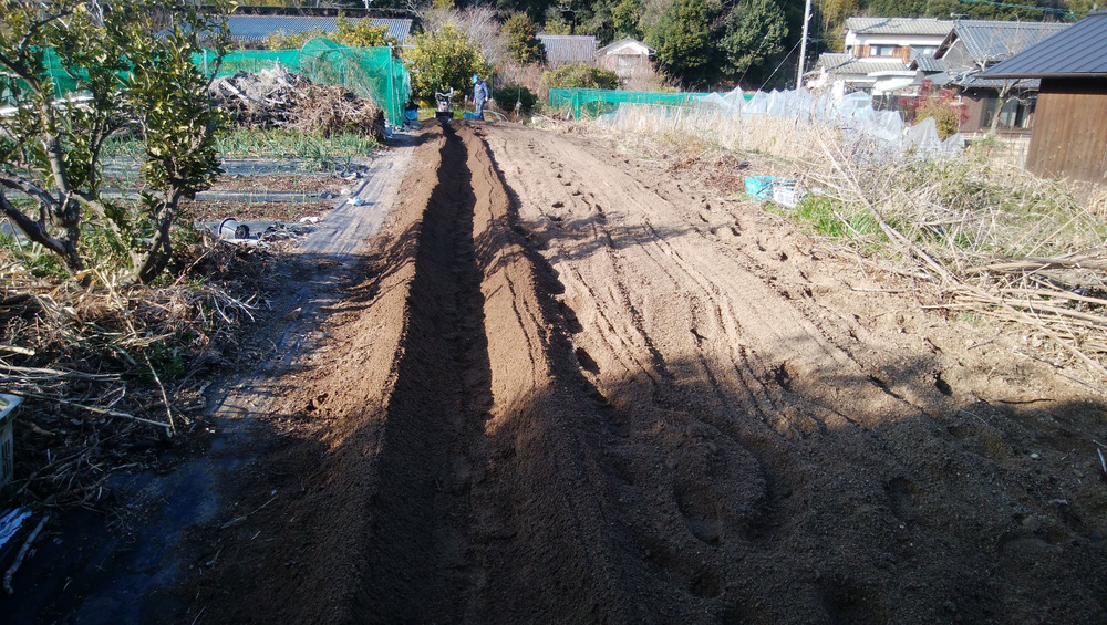 土壌pHの検査の結果、石灰を撒く必要はないことがわかったので、牛糞堆肥や鶏糞ペレット、唐辛子(土中でイモを食べる虫を駆逐するため)を撒いた後、中耕、畝たてをし、ジャガイモを植え付けました。