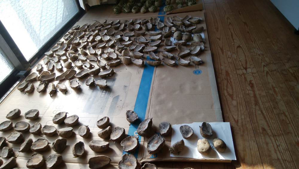 種ジャガイモは、植えるのに適切な大きさに切って、切り口を乾かすために、窓際の日の当たる場所に置いておきました。かなり干からびた感じになっていますが、芽が黒く太くなってきました。