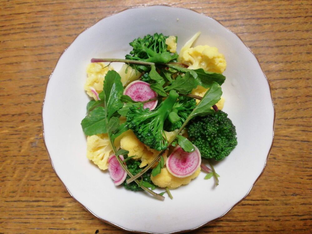 今日の食卓には、ルッコラのおひたし、ルッコラとカリフラワー、ブロッコリー、北京水大根のサラダが登場しました。彩りがよく、春らしさを味わいました。