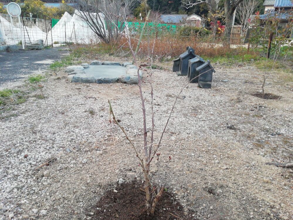 当農園の畑の隣にある島四国24番札所は、「オオミシマスペースOMOYA」さんにも隣接しています。「オオミシマスペースOMOYA」さんは、古民家を改装した宿泊施設。24番札所は地域の人たちで管理していますが、この度、「オオミシマスペースOMOYA」さんが、宿泊施設の庭の整備に合わせて、札所の庭も整備してくれました(@omishimaspace)。小さな祠の周りに植えてもらったのは、3本の桜。中央に四季桜、両脇に啓翁桜です。