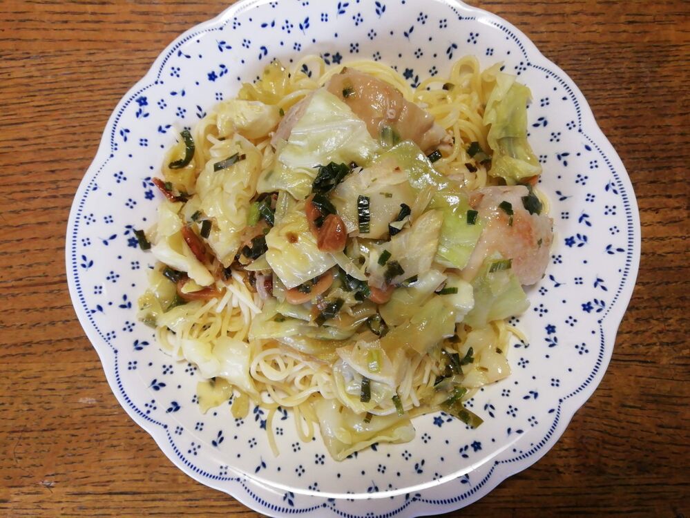 今日は、葉ニンニクとキャベツを使ってパスタを作りました。ニンニクの醤油漬けも刻んで加え、味を調えました。葉ニンニクの香りとニンニクの醤油漬けのうま味、キャベツの甘味が楽しめました。