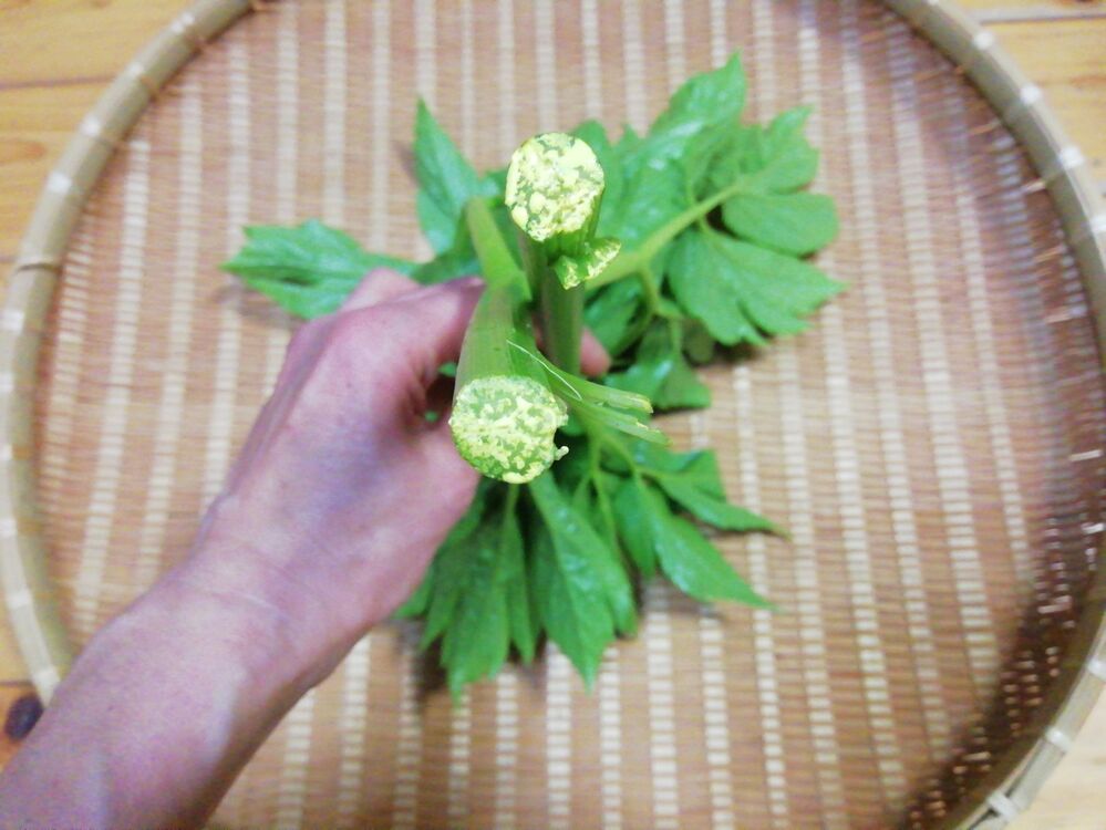 大きくなるのを1年待っていたアシタバが、やっと出荷サイズになりました。茎を切ると、黄色い汁液が出ます。天ぷらやおひたしにして、軸の根元まで食べました。