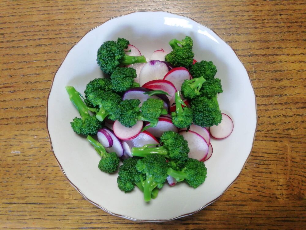 今日は、ハツカダイコンとブロッコリーのサラダを作りました。ブロッコリーは、最初に収穫した後、脇芽がたくさん出てきます。直径2~3cmの脇芽は一口サイズで食べやすく、かわいいです。