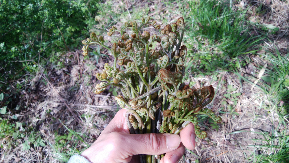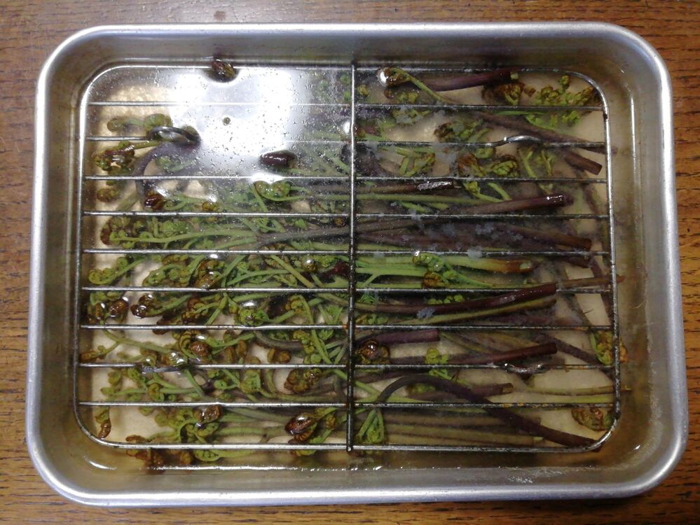 昨日の花見の際、ワラビを少し採ってきました。ベーキングパウダーをふりかけた上から熱湯をかけて、あく抜きします。さあ、どうやって食べましょうか?