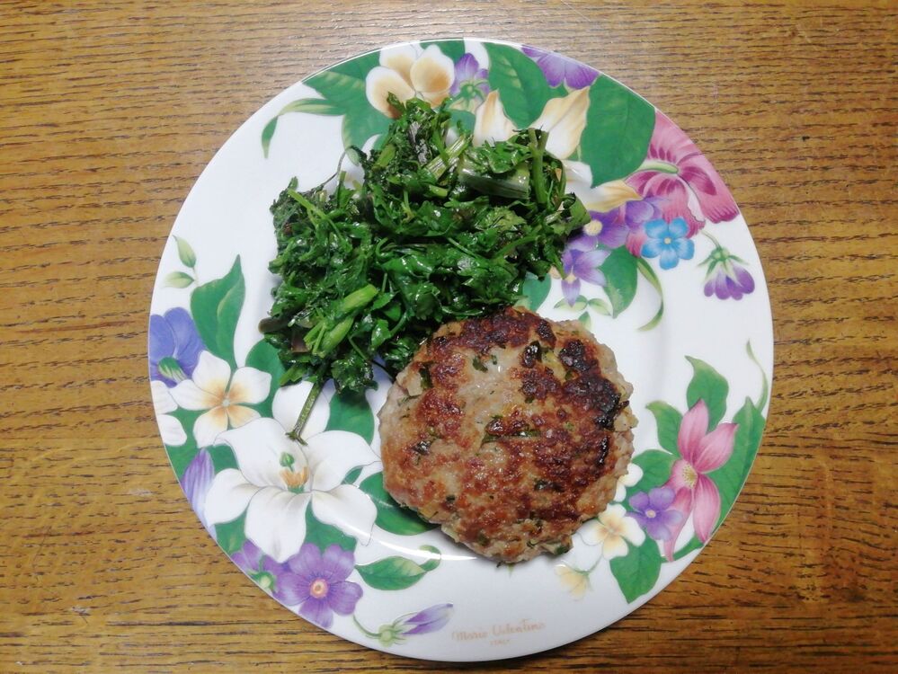 「プチヴェールの葉のハンバーグ」に「パクチーの炒め物」を添えてみました。