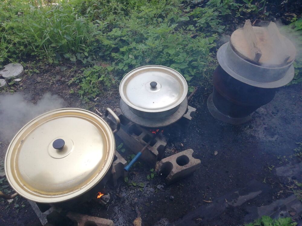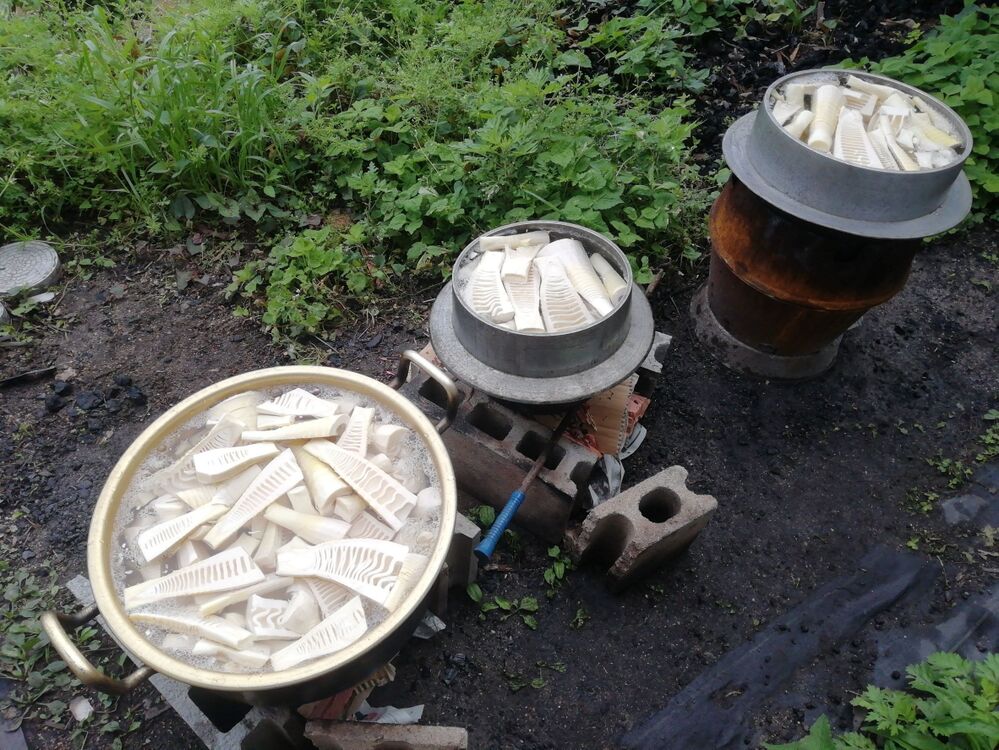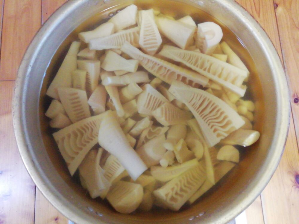 今日は、タケノコの水煮を作りました。皮をむき、縦半分に切ったタケノコを、3つの鍋や羽釜で水煮にしました。