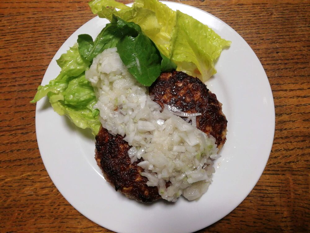 タケノコを細かく刻んで入れたハンバーグを作り、酢タマネギをのせてみました。付け合せは、ロメインレタスです。