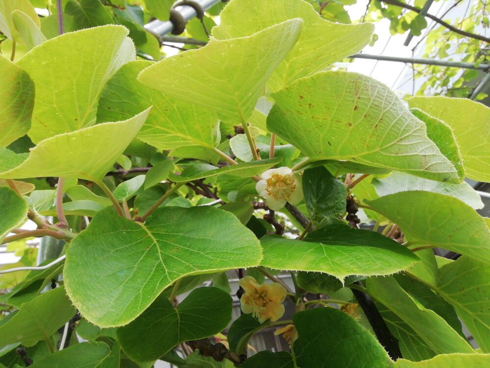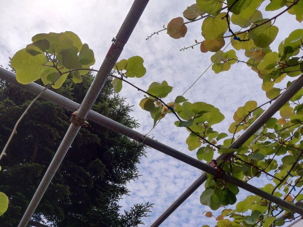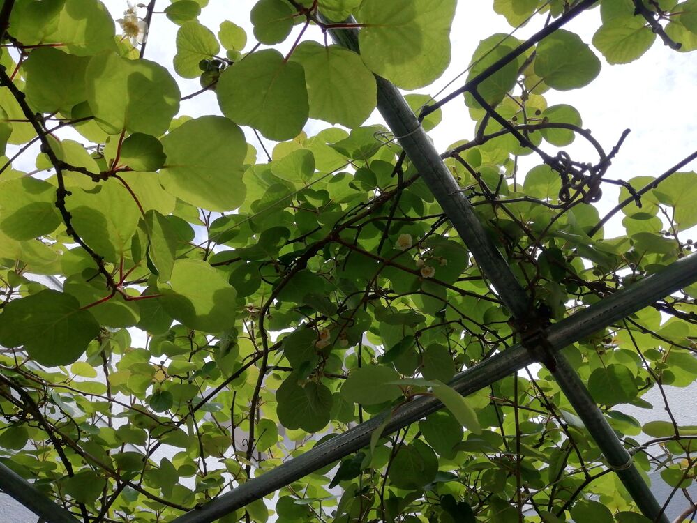 中庭のキウイのつぼみが膨らみ、花が咲き始めました。