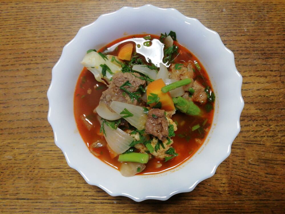 カリフラワーとタマネギ、ニンジンの葉と根、アスパラ、牛肉のスープ