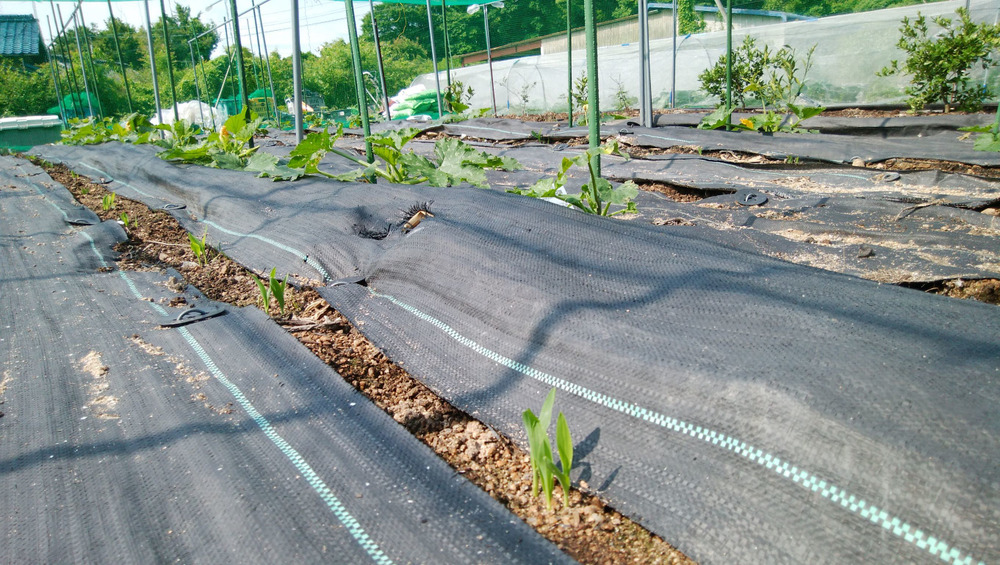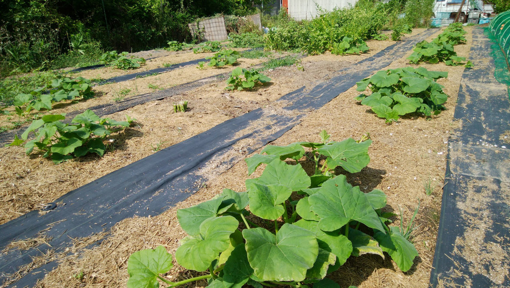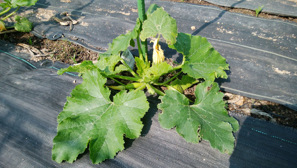 かぼちゃのつるが伸び始め、ズッキーニは小さな実がついています。トウモロコシも発芽したようです。植えた苗や種が、が順調に生長・発芽しています。