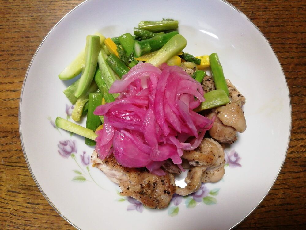前回紹介した赤タマネギのドレッシングを、鶏肉ソテーとアスパラガス・ズッキーニの炒め物にのせていただきました。