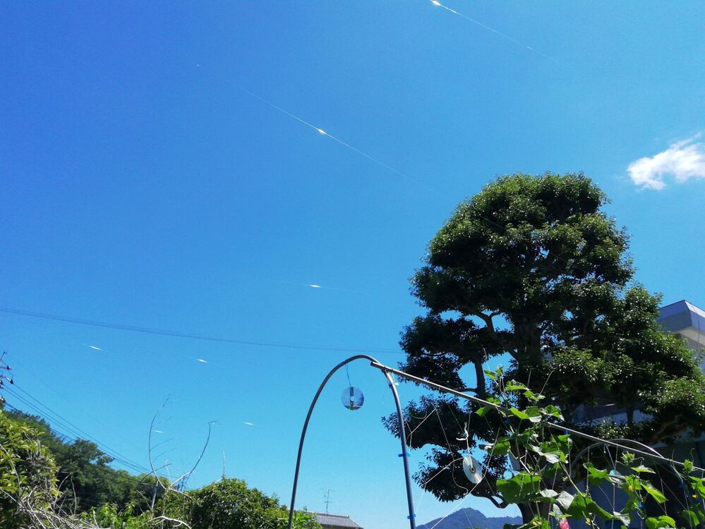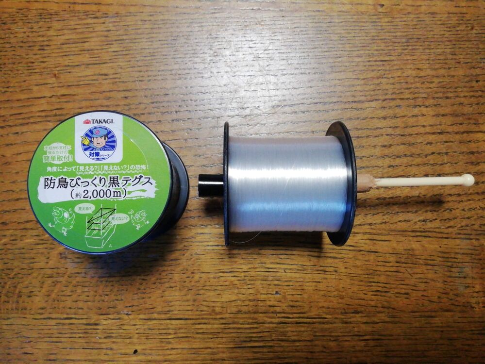 キュウリが鳥に食べられる被害が出たので、高い位置に鳥よけのテグスを張りました。今日は、カラスなどの大型の鳥は来ていないようです。