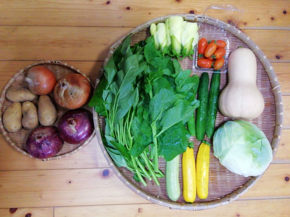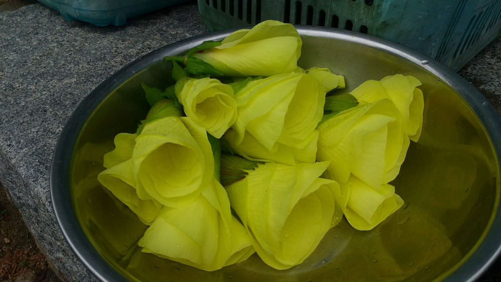 最近収穫量の増えてきた花オクラ入りの野菜セットの販売を始めました。花オクラは、食べられる花、エディブルフラワーです。午前6時前に、つぼみが開き始めたところで収穫するのがベストのようです。1~2日は、冷蔵保存ができるようです。