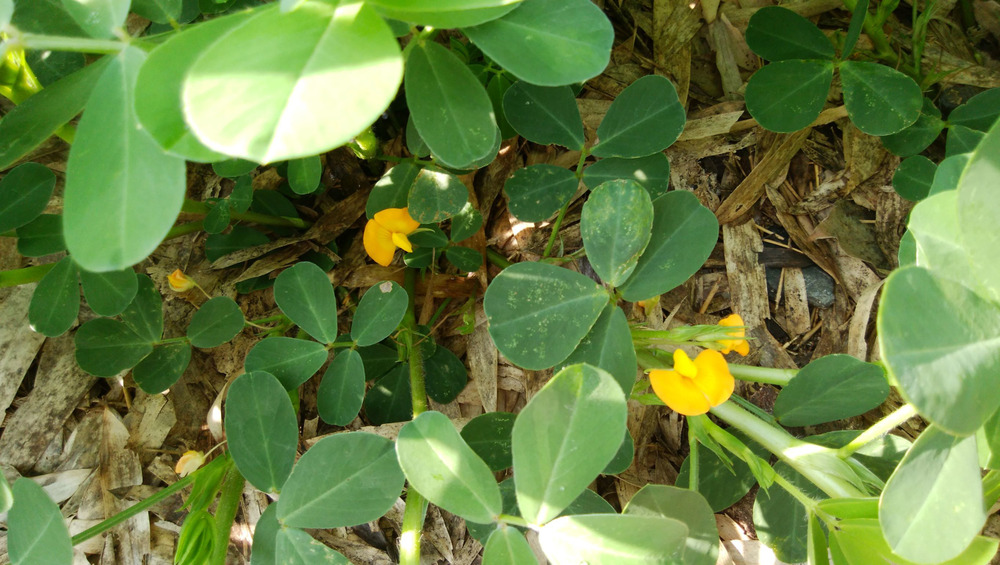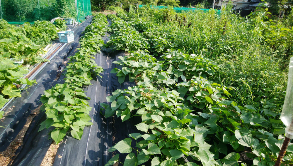 サツマイモは、植えるのが遅くなった割に、よく降る雨のおかげでよく生長しています。落花生にも、順調に花がついています。