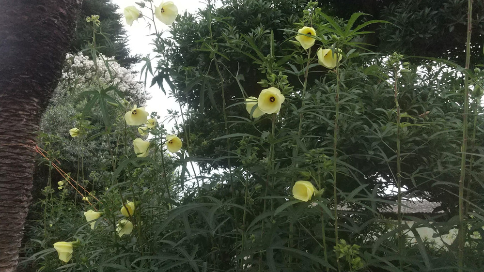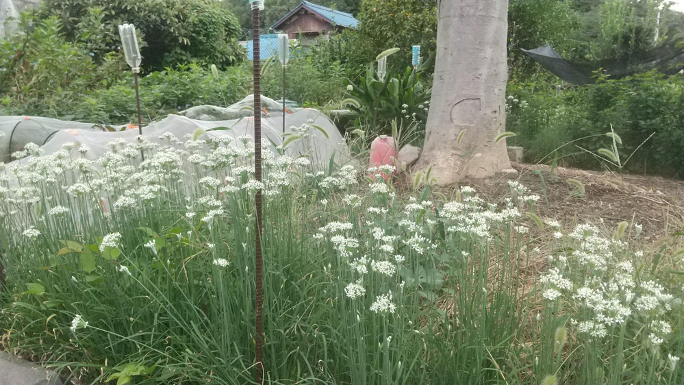 我が家の庭のニラの花が満開になっています。セイヨウミツバチにとっては、貴重な蜜源になっています。また、花オクラは、1年目の株も含めて、どの株からも花が咲くようになってきました。雨は降らずとも、秋ミョウガが顔を覗かせています。