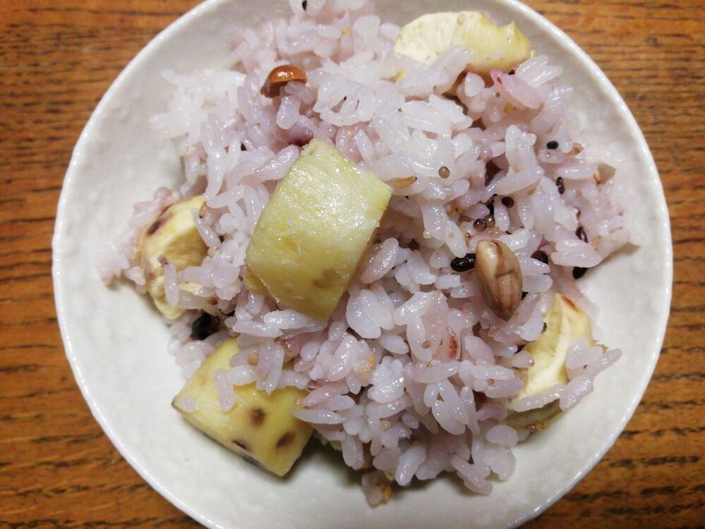 試し堀りのサツマイモや落花生と栗をご飯にしてみました