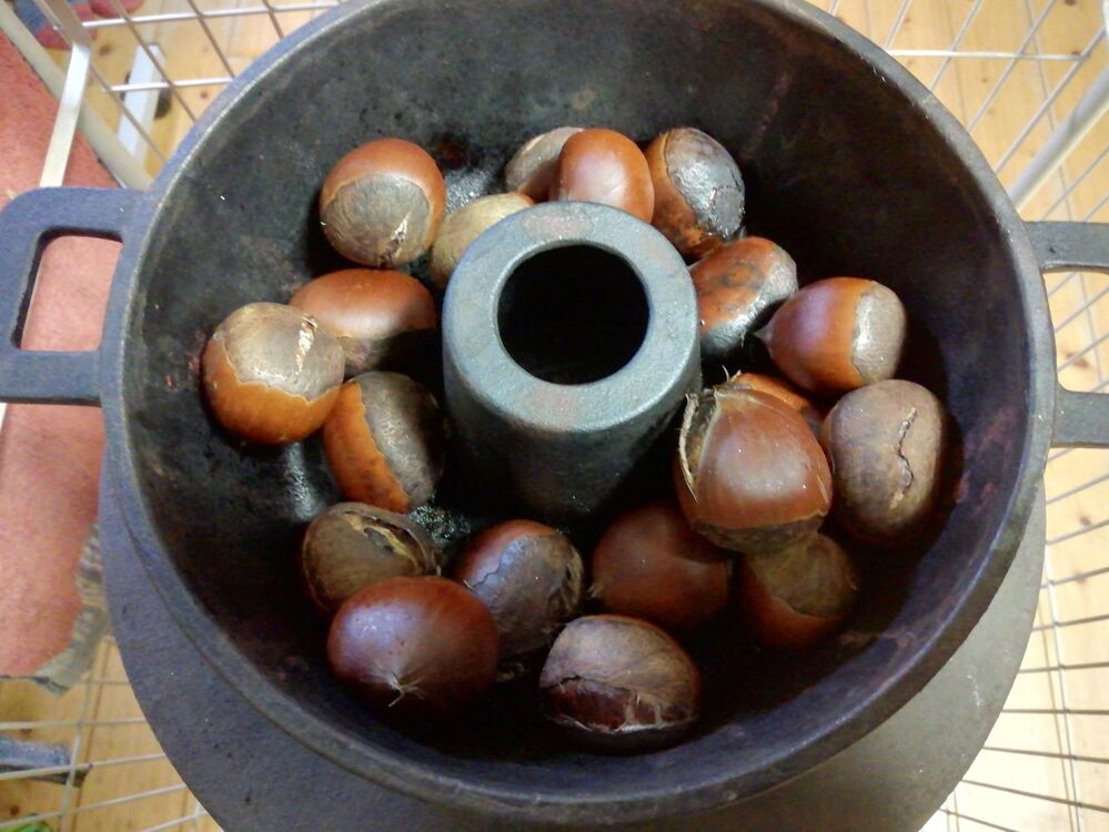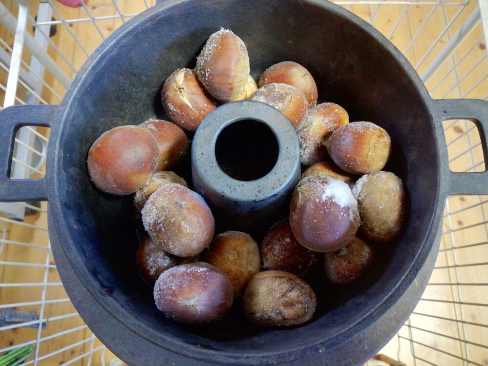 今日は、焼き栗を作ってみました。秋に収穫していた皮つきの冷凍栗を鉄鍋に入れ、薪ストーブにかけました。出来上がりのサインは、美味しそうな焼き栗の香りです。