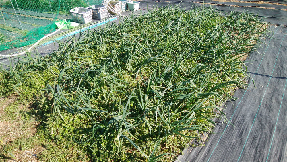 当農場の葉付きタマネギが大きくなりました。この葉付きタマネギは、セット球と呼ばれる小さい球根を、9月に300球ほど植えたものです。