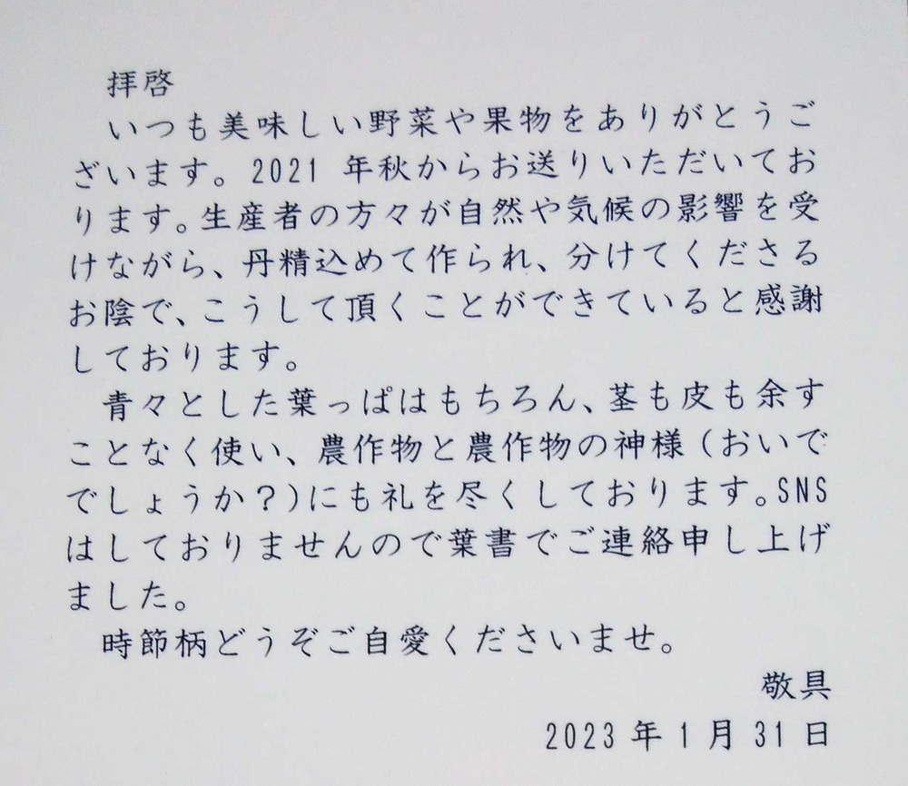 私たちにいただいたメッセージは、何よりの励みになります。お届けした野菜や果物を使ったお料理の写真はとても興味深く、栽培する品種を検討する際の参考になりますし、お客様にご紹介するレシピや調理例の参考にもなります。
