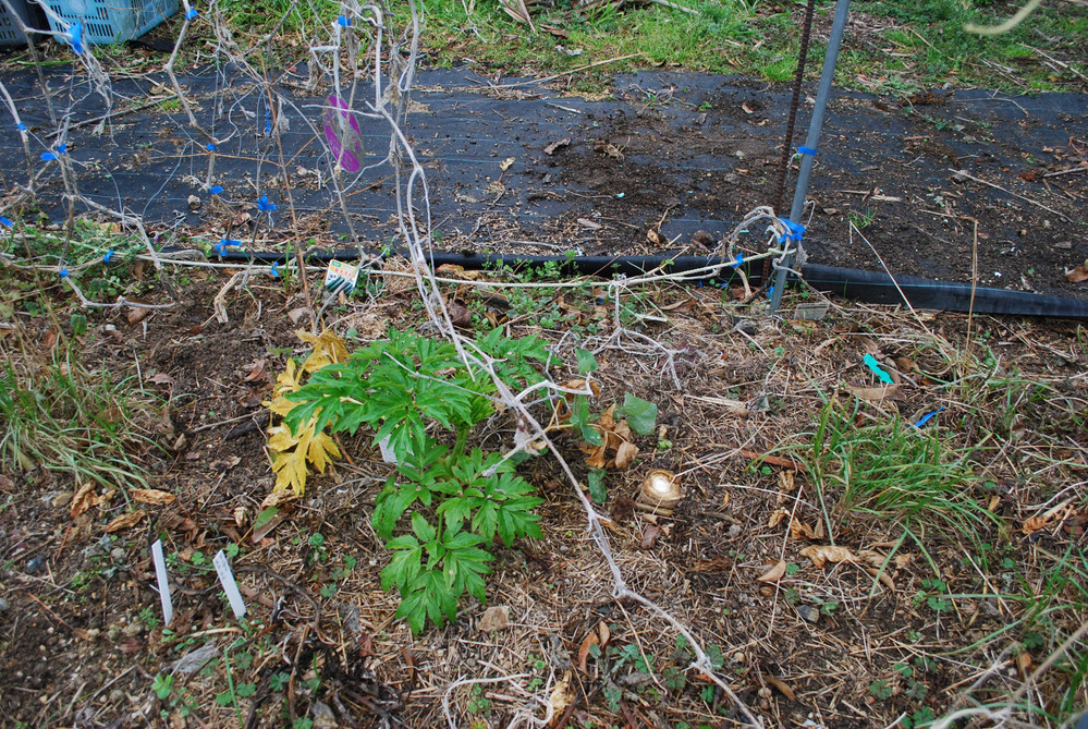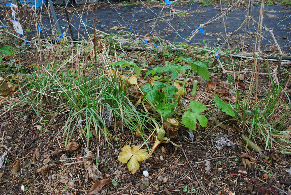 春に向かって畑を片付けていると、冬越し出来そうなアシタバを見つけました。アシタバは、苗を植えた1年目は株の充実に努め、2年目から収穫しています。2年目の株は大部分が枯れましたが、わき芽が出たものが生きているようです。また、今年2年目を迎える株も、元気なようです。