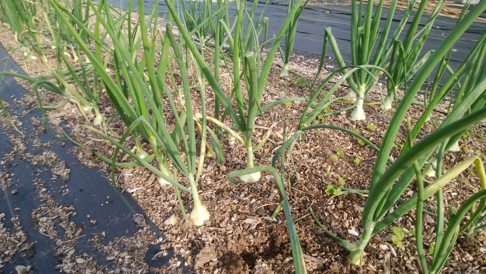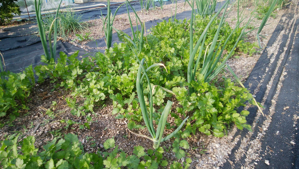 葉付きタマネギが、どんどん大きくなっています。収穫が終わったところへは、パクチーがこぼれ種で生えており、助かっています。この後は、カボチャ畑になります。