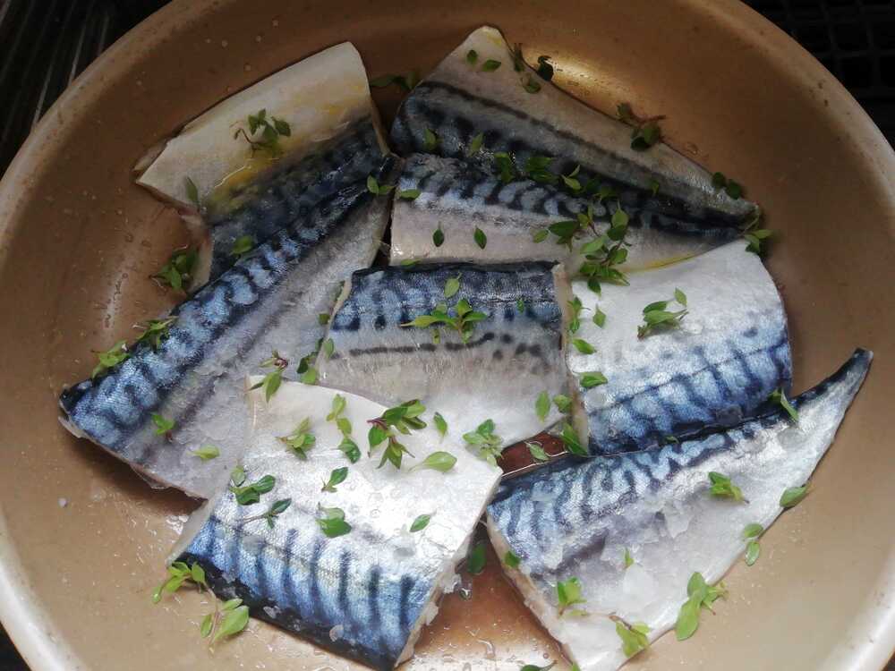 サバにクリーピングタイムの葉を散らして焼いてみました
