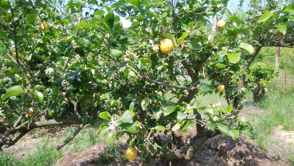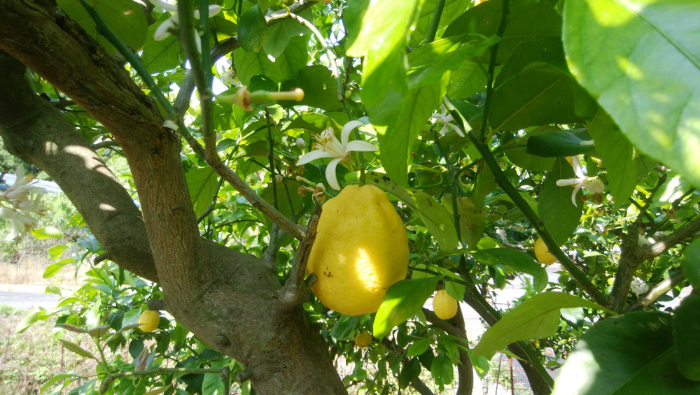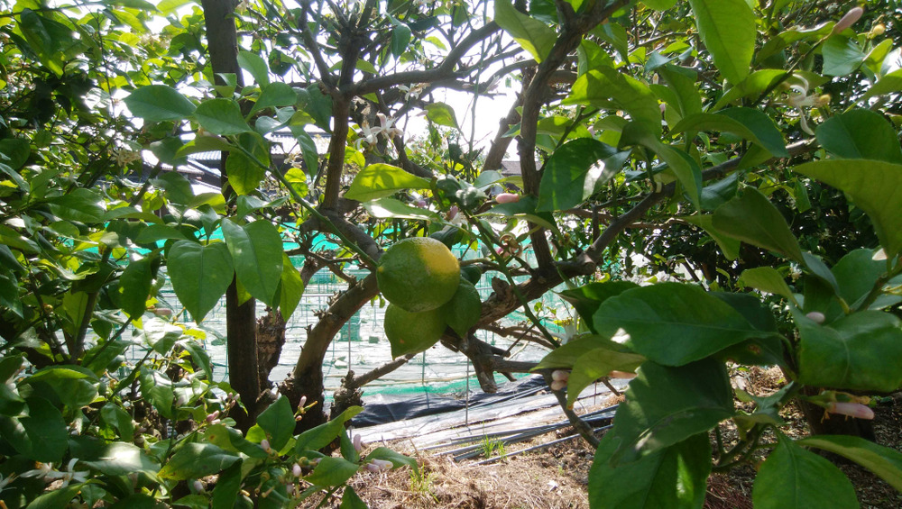当農場のレモンは、現在先端がピンクの花がたくさん咲いています。また、小さな青い果実、青から黄色になりつつある果実、黄色の果実、巨大な白っぽくなっている完熟の果実など、いろいろな大きさや色の果実が生っています。