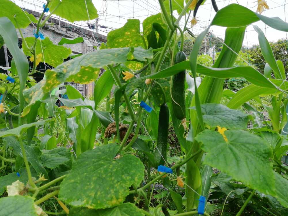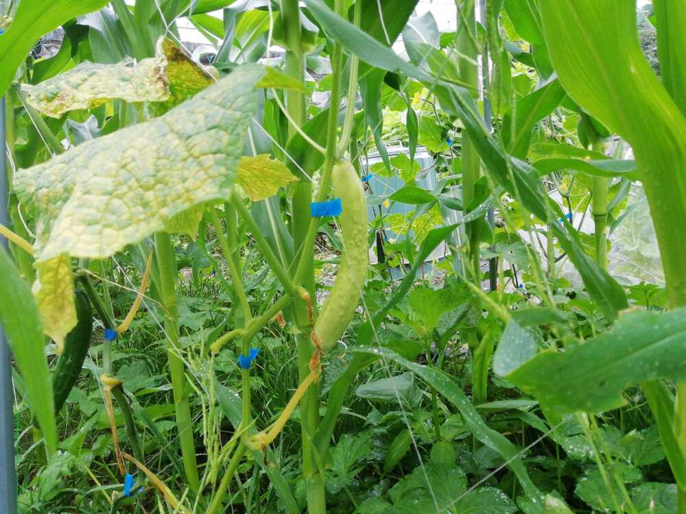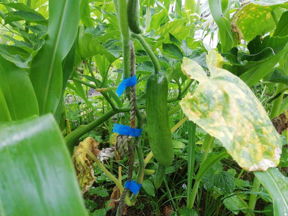 今年はいろいろな種類のキュウリを植えています。ミニキュウリは、節成り、房成りで、たくさん成りそうです。実の大きさも、8~10cmのもの、18~20cmのものなど、何段階かに分けられます。白っぽい色のキュウリもあります。味も含めて、楽しめそうです。