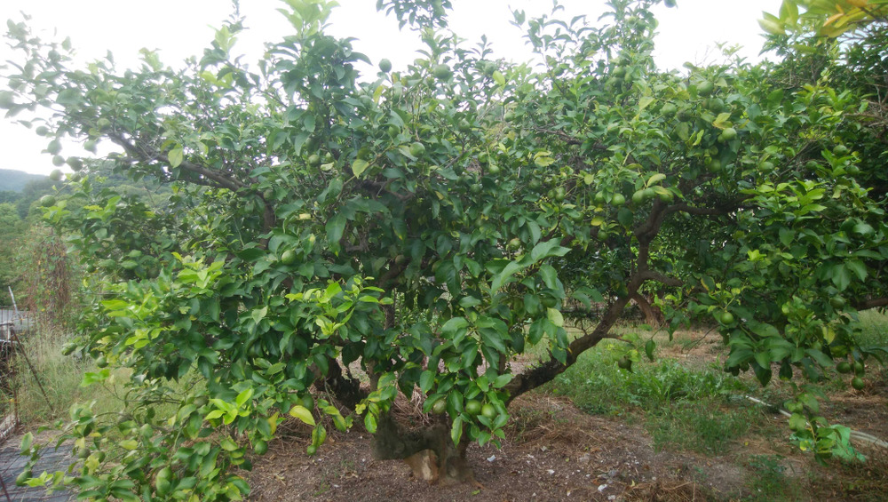 レモンの木です。いろいろなサイズが混在しています。果皮の青いグリーンレモンの状態ですが、出荷サイズに生長した果実がかなり増えてきました。これからの色の変化も楽しみです。