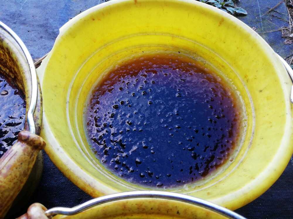 我が家の薪ストーブは、家の裏、北側に煙突があります。この煙突から滴り落ちる木酢液を、小さいバケツに溜めています。このバケツに溜めている木酢液が、今年初めて凍っていました。今年一番の寒さです。