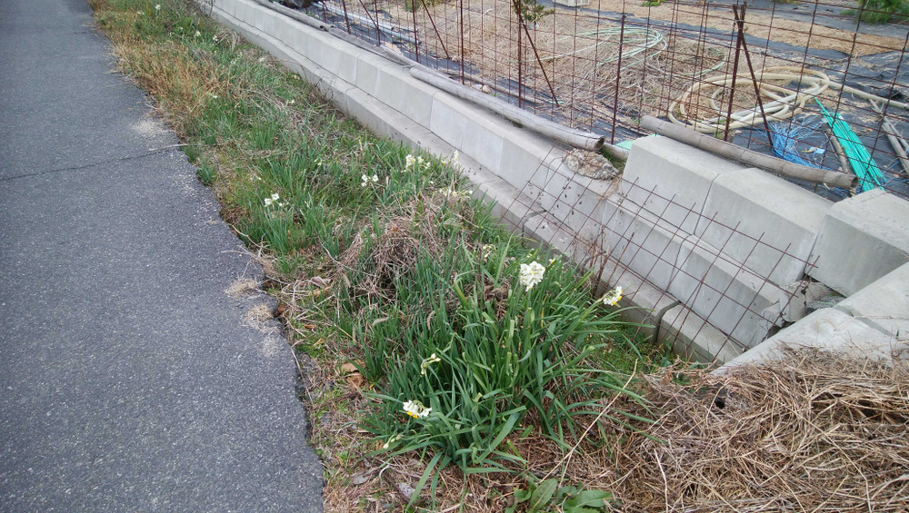 野菜畑前の道路の法面に、水仙や彼岸花の球根を植えています。球根に毒のある水仙や彼岸花で、イノシシが法面を掘り返して崩すのを防ぐことができるかもしれないと思っていましたが、イノシシは、関係なく掘り返すようです。そこで、地面に直接イノシシ柵を敷き、イノシシが掘り返さないように法面を保護しています。今年はかなり水仙が増え、花を咲かせる株が増えてきました。イノシシ対策にはなりませんでしたが、きれいなので、水仙が増えるのは大歓迎です。